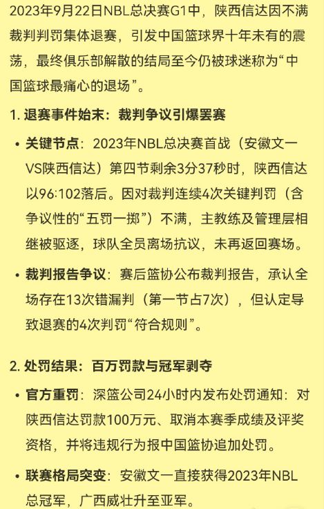 102号裁判孙翌淼还有更大的吹罚争议。有网友证实,他正是导致曾经的NBL冠军强队陕西信达队当年愤然退赛的当值裁判员之一。而陕西信达队当场退赛的原因,正是对裁判员的吹罚强烈不满。